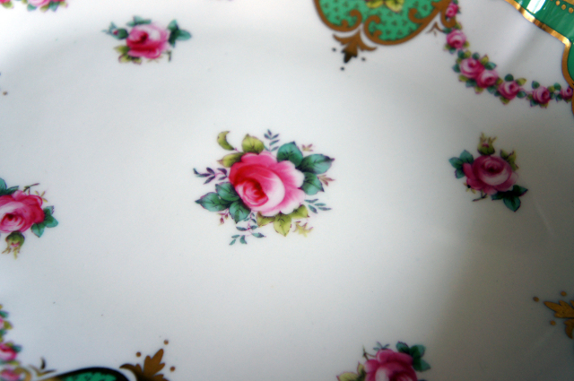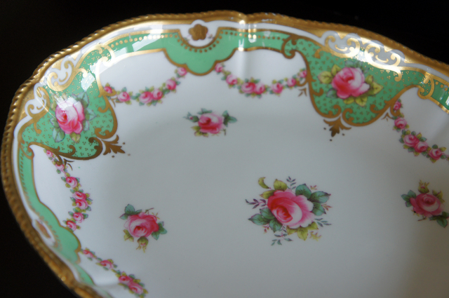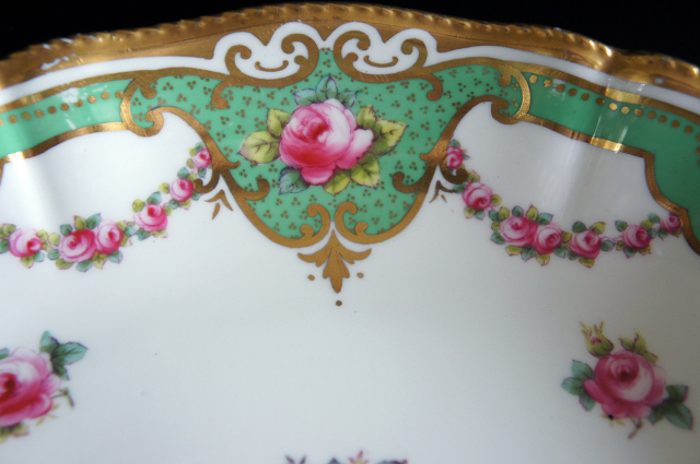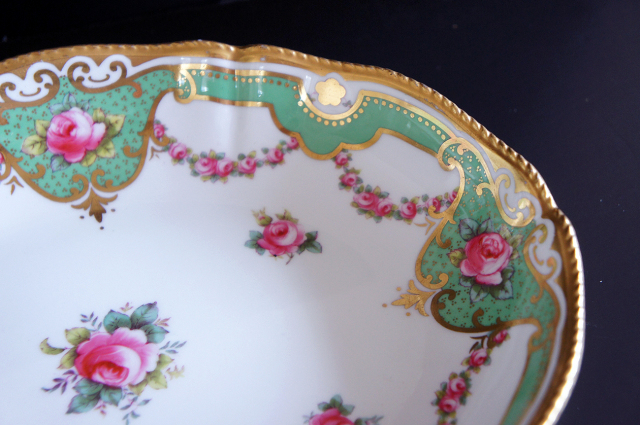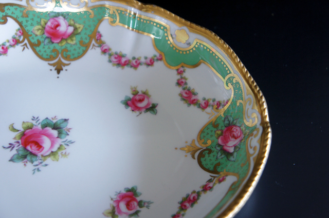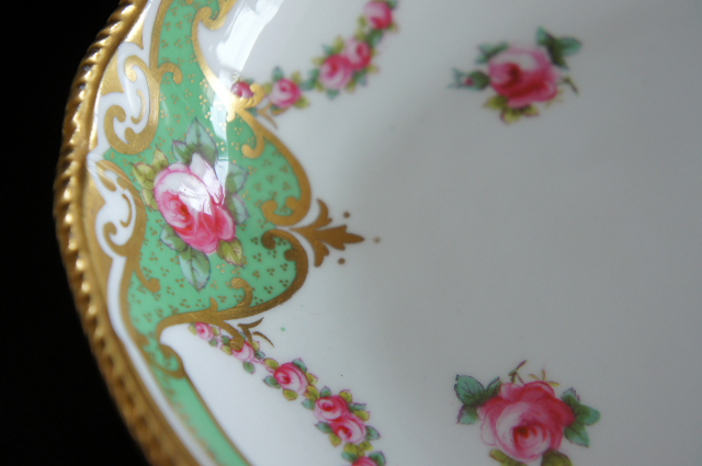 美しく優しい色調のグリーンのリムに、ピンクの薔薇、金彩が豪華に施され、ヴィクトリア時代の優雅さを存分に味わうことのできるお品です。繊細で上品な雰囲気が漂い、テーブルに華やぎと幸せが溢れます。