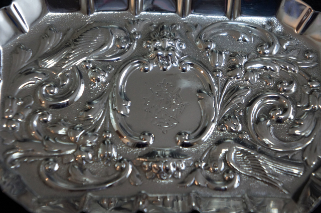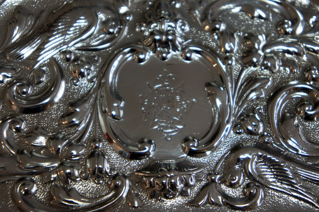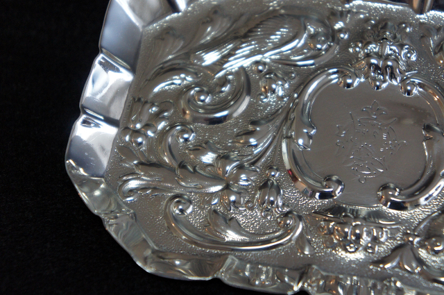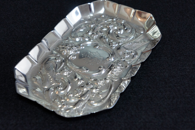 美しいモチーフが施された、シルバーの長方形型トレイです。