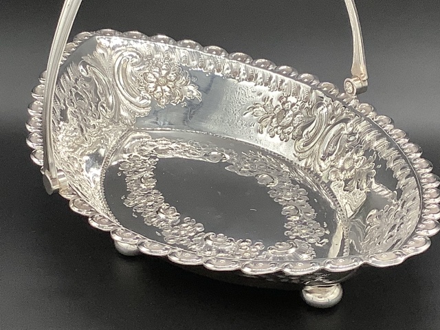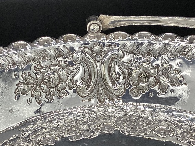 イギリス ヴィクトリア時代のシルバープレートバスケットです。 全体に打ち出された模様が優美で豪華です。 パンや焼き菓子などをサーブするのに丁度良いサイズです。 サイズ 28cm x18.5cm(最大箇所) 高さ5cm (21cm ハンドル部含む)