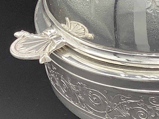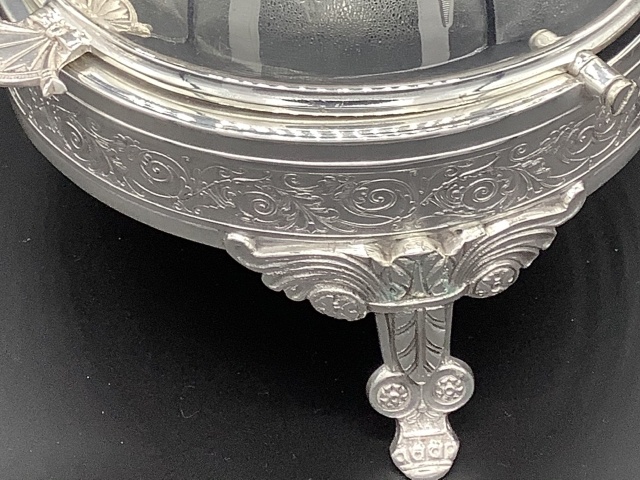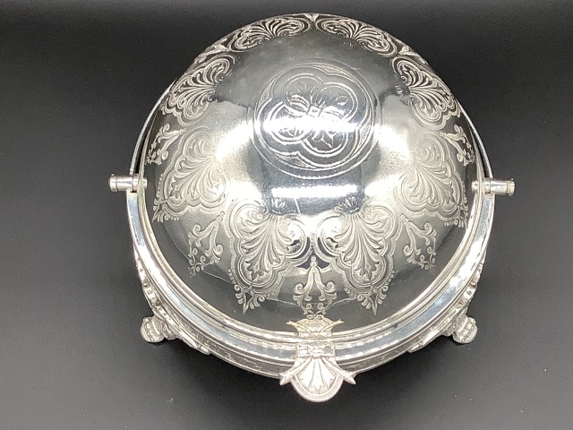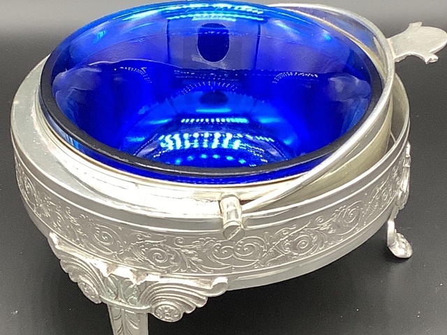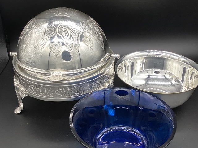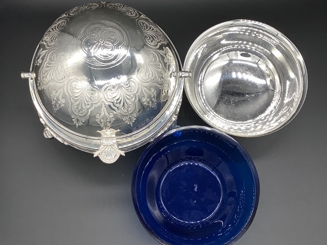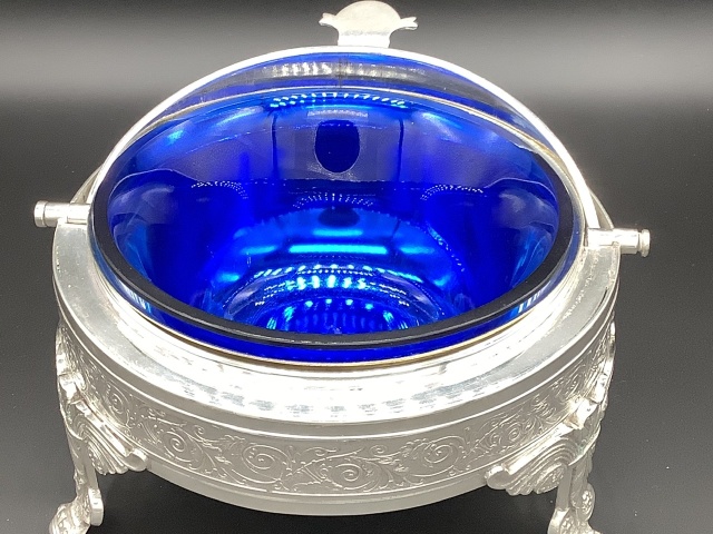 イギリス ヴィクトリア時代のドーム型ディッシュです。 シルバープレートのドームを開けると、内側にシルバープレートのボウルとブルーグラスライナーが収まってます。 美しいシェイプと豪華なデザインのディッシュはテーブルを華やかに演出します。 このサイズのドーム型はレアなお品です。 サイズ ドーム直径17cm 高さ14cm ブルーグラスライナー直径12、3cm高さ6cm